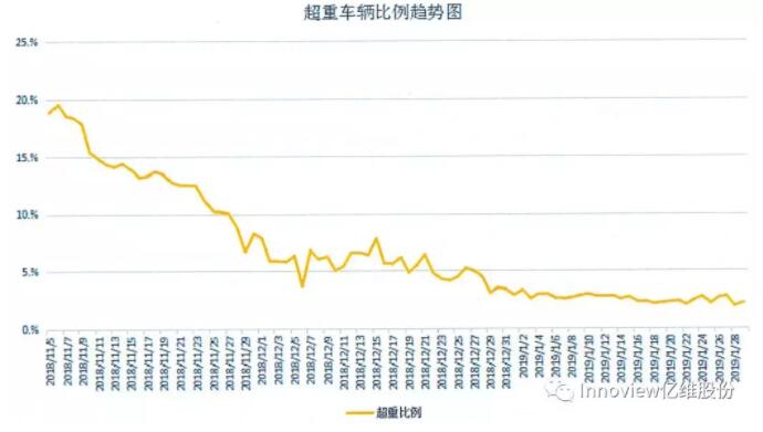 金鳳凰大橋非現(xiàn)場執(zhí)法點建成后,超限超載現(xiàn)象得到有效遏制。在一個月內(nèi),日超載比例由18%下降至3%。日超載數(shù)量也由2018年11月初的日均861輛降至2019年1月底日均183輛。超重超載車輛從絕對數(shù)量和相對比例均出現(xiàn)了大幅下降,治超效果明顯。