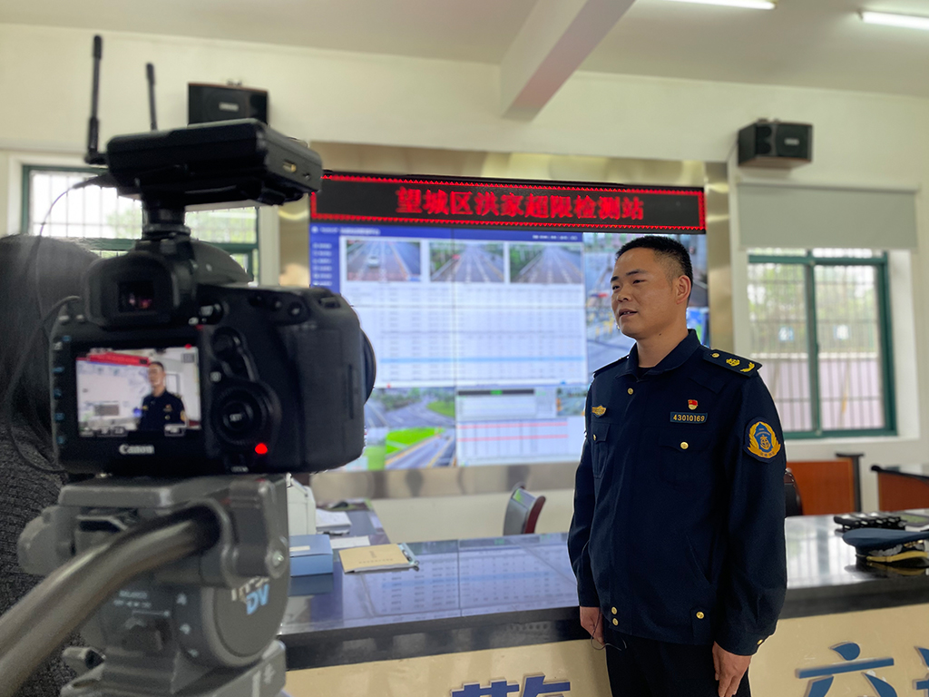 ▲長(zhǎng)沙望城區(qū)交通運(yùn)輸綜合行政大隊(duì)洪家超限檢測(cè)站站長(zhǎng)接受湖南經(jīng)視采訪