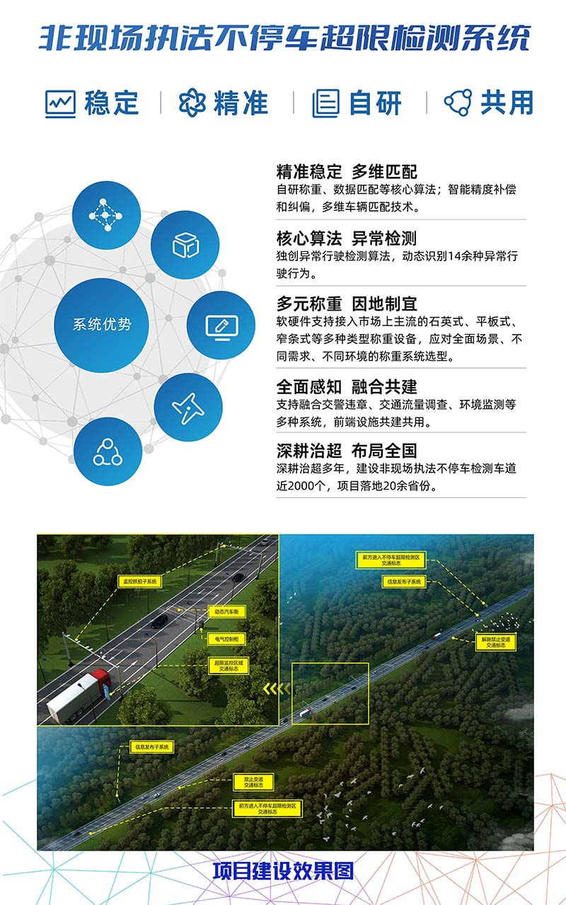 非現(xiàn)場執(zhí)法不停車超限檢測系統(tǒng)是億維股份的另一款明星產(chǎn)品。該系統(tǒng)采用億維股份獨創(chuàng)異常行駛檢測算法,動態(tài)識別多種車輛異常行駛行為,無需停車即可完成超限檢測,大大提高了執(zhí)法效率和準(zhǔn)確性。同時,該系統(tǒng)還能實現(xiàn)車輛信息自動識別、測量數(shù)據(jù)實時上傳等功能,有力推動了交通執(zhí)法的智能化進程。