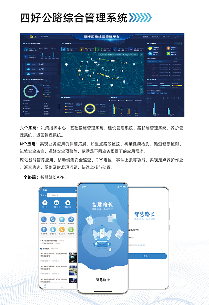 智慧公路綜合管理系統(tǒng)以實現(xiàn)“智慧監(jiān)測、智慧管理、智慧決策、智慧服務(wù)”為目標(biāo),系統(tǒng)利用大數(shù)據(jù)、云計算、人工智能等技術(shù),實現(xiàn)交通掌控精細(xì)化,構(gòu)建智慧交通體系“大腦”。